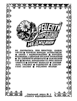 Рецепти народної медицини. Спеціальний випуск № 2 «ГОЛОСУ ВІДРОДЖЕННЯ», Бродівська районна друкарня, 1992 р. |