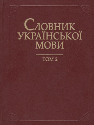 Другий том академічного тлумачного Словника української мови у 20 томах охоплює загальновживану лексику сучасної української літературної мови, поширені терміни, діалектизми, усталені словосполучення. Джерела, використані у Словнику, відображають лексику текстів художньої літератури, починаючи з кінця XVIII століття до наших днів, Біблії, народної творчості, публіцистики, науково-популярних і наукових праць, мови засобів масової інформації, мови Інтернету та ін.