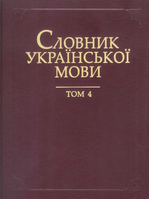 Четвертий том академічного тлумачного Словника української мови у 20 томах охоплює загальновживану лексику сучасної уіфаїнсьюої літературної мови, поширені терміни, діалектизми, усталені словосполучення. Джерела, використані у Словнику, відображають лексику текстів художньої літератури, починаючи з кінця XVIII століття до наших днів, Біблії, народної творчості, публіцистики, науково-популярних і наукових праць, мови засобів масової інформації, мови Інтернету та ін.